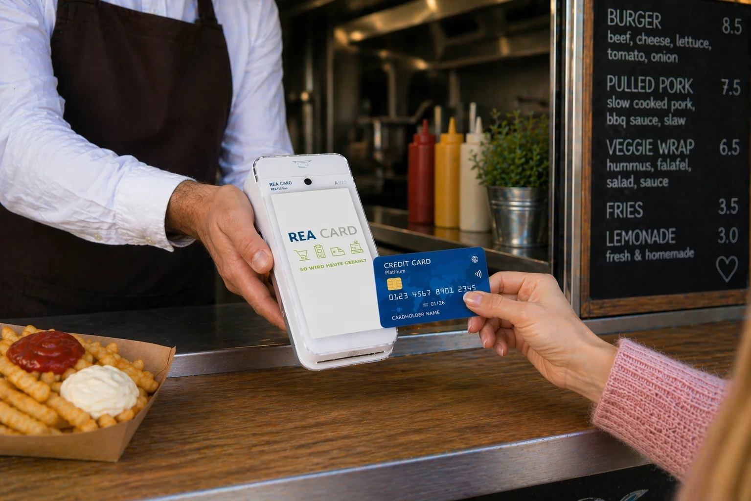 Ein modernes Terminal arbeitet einfacher, als viele Gründer vermuten. Sie geben den Betrag ein, der Gast hält Karte, Smartphone oder Smartwatch an das Gerät, das Terminal prüft die Zahlung und bestätigt den Vorgang. Fertig. Bei kontaktlosen Zahlungen nutzt das Gerät die NFC-Schnittstelle. Laut dem Ratgeber von girocard, HDE und IDZ wird die Karte dabei nicht gesteckt, sondern nur wenige Zentimeter vor das Terminal gehalten. Für geringe Beträge bis derzeit 50 Euro entfällt in der Regel die PIN-Eingabe. Höhere Beträge lassen sich ebenfalls kontaktlos bezahlen, dann mit PIN oder anderer Verifikation. Das gilt auch für mobile Wallets. Für den Foodtruck-Alltag ist das ideal, weil der Bezahlvorgang kurz bleibt und der Gast nicht lange an der Ausgabe steht.